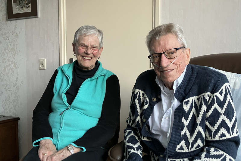 Het is een doordeweekse winterdag wanneer we aanbellen bij de familie Visser. Riek Visser (73 jaar) laat ons binnen. In de woonkamer ontmoeten we haar man Rob (81 jaar). Hij zit in zijn stoel voor het raam. Dwars door de woonkamer, tussen hem en de slaapkamer, loopt een dun slangetje; zijn levenslijn.